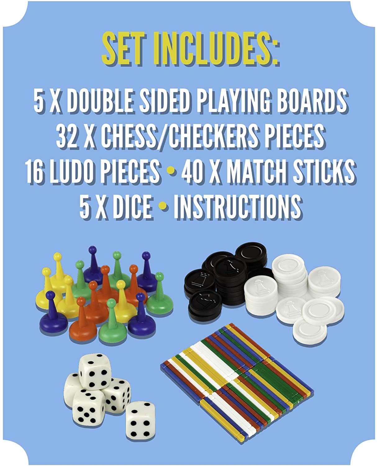 Set includes 5 Double-Sided Playing Boards, 32 x Chess / Checkers Pieces, 16 Ludo Pieces, 40 x Match Sticks, 5 x Dice and Full Instructions.
