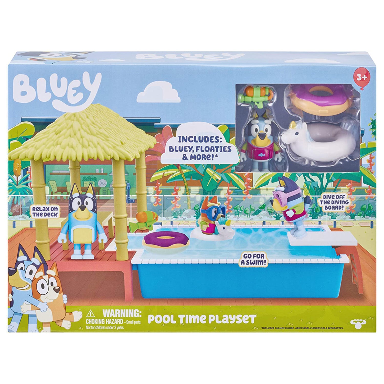 Take a break from the sun and relax on the deck under the cabana. Dressed in her swimsuit, Bluey is ready for some fun in the sun with all her favourite pool toys and accessories. Dive Bluey off the diving board and go for a swim. Place Bluey in her donut or adorable unicorn floaties. Pop the swim goggles on Bluey’s face and start a pretend water fight with the water blaster! This Pool Time Playset can even be filled with water for an even more realistic play experience!