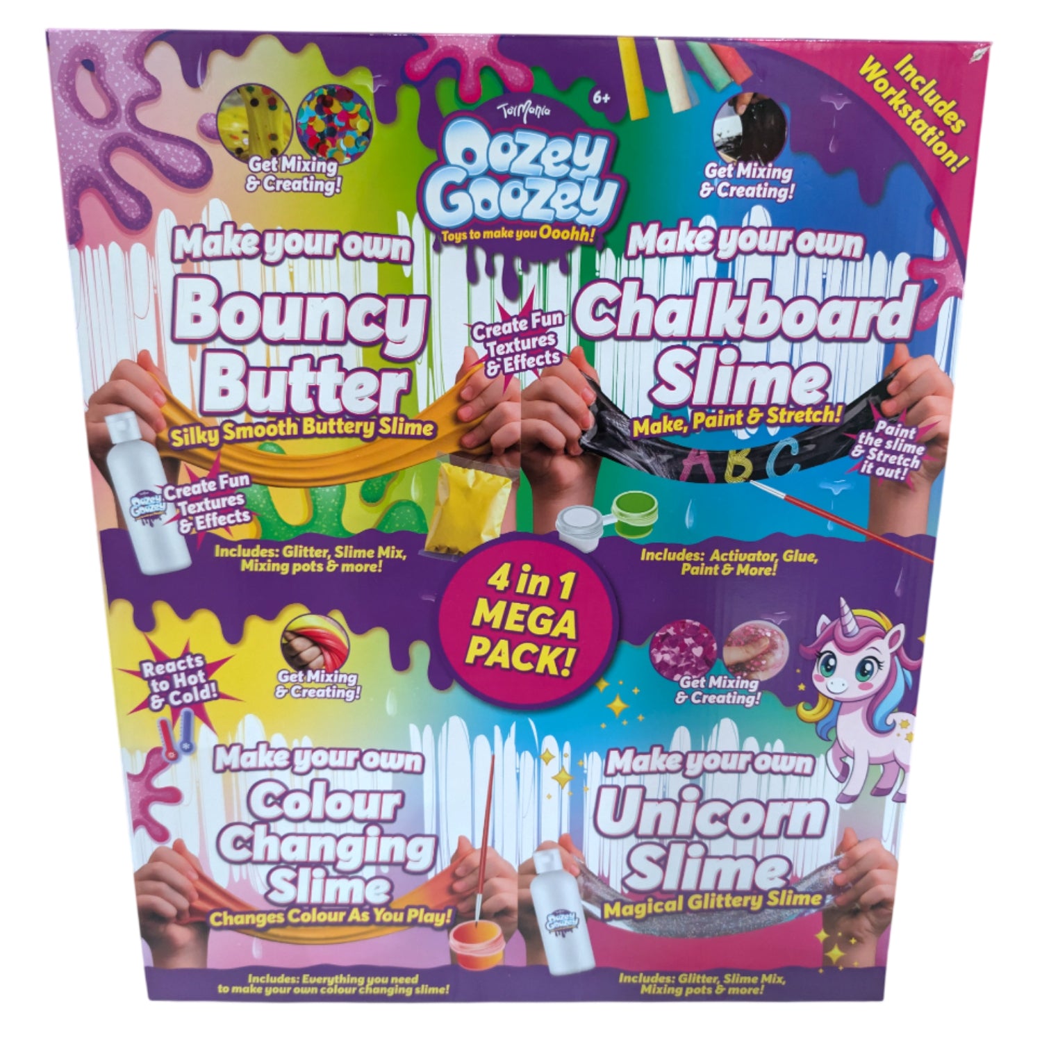 Make your own Bouncy Butter, Chalkboard, Colour Changing, and Unicorn Slimes, each with fun textures and effects for hours of endless creative sensory play.
