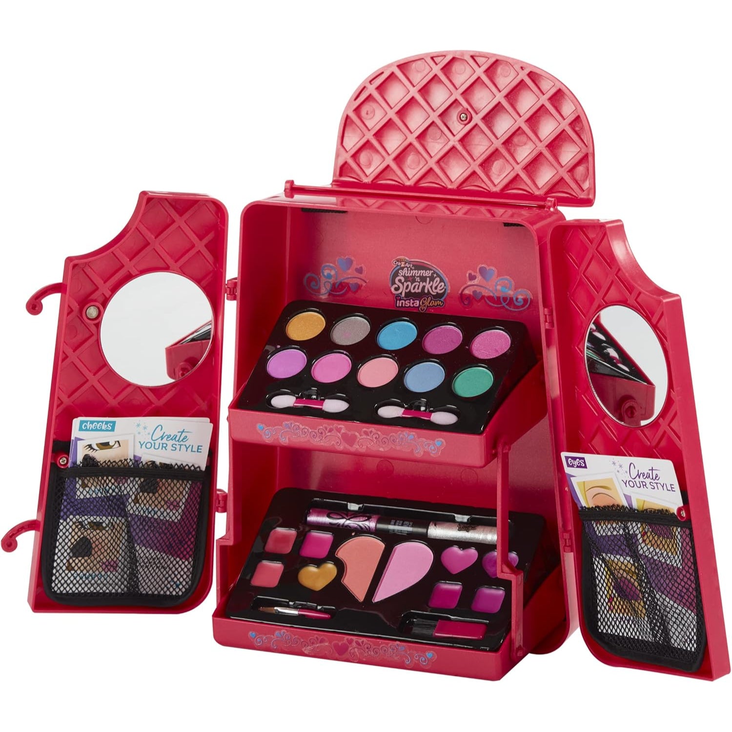 Cute make-up backpack with 2 mirrors plus, eyeshadows, lip colours and cheek colours. Includes make-up brushes and makeup tip cards. There's over 20 different colours! Trays fold out for easy access! Then close it up and take with you, for beauty-on-the-go!